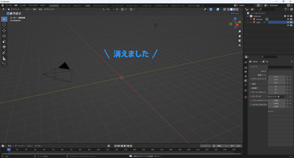 今回は空き缶を作るので、デフォルトで表示されているこの四角いオブジェクトは一旦削除します。